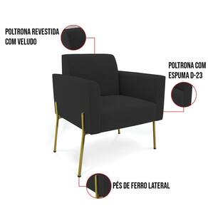 Todo mundo gosta de um ambiente bem decorado, e se for novidade melhor ainda não é mesmo? A D'Rossi, além de entregar beleza, qualidade e confiança aos clientes, ela dispõe das melhores opções em produtos, disponíveis no mercado! Portanto, se você quer um produto sofisticado, opte pela Poltrona Marisa. Ela possui um design lindo e sofisticado, com pés de Ferro Lateral Dourado e revestimento em tecido Veludo Preto, que harmonizam com qualquer ambiente. Esta mobília fica perfeita na sala de estar, recepções, mesa de jantar ou qualquer outro espaço que você queira decorar com estilo e bom gosto. Ela contém uma estrutura em madeira de reflorestamento eucalipto, que garante a resistência e a sustentabilidade do produto. Ela suporta até 120 kg de peso, podendo ser utilizada por pessoas de diferentes biotipos. Ela tem um acabamento reforçado e espuma de qualidade D-23, garantindo flexibilidade e conforto ao usuário. A Poltrona Marisa é um produto de alta qualidade, beleza e funcionalidade. Ela é fácil de transportar, pois tem um peso leve e um tamanho compacto. A Poltrona Marisa é ideal, para dar aquele realce que seu ambiente precisa. Tenho certeza que esse móvel é a melhor compra que você irá fazer. Garanta já sua Poltrona Marisa e se acomode da melhor maneira possível!