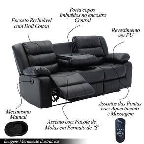 Poltrona Reclinável 3 Lugares Oscar G31 Manual Porta Copos Massagem Aquecimento Preto Gran Belo