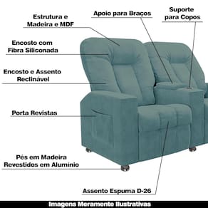Que tal criar seu próprio home cinema? Aqui, vamos mostrar como você pode montar o seu! Com o local adequado, alguns itens decorativos e uma poltrona ideal, você garantirá um espaço confortável e imersivo. O primeiro passo é investir em equipamentos de alta qualidade! Olha só que lindeza a nossa Poltrona Reclinável Para Cinema 2 Lugares. Ela foi projetada para proporcionar máximo conforto e funcionalidade, esta poltrona é a escolha ideal para quem busca relaxamento, estilo e uma experiência de cinema privada. Seu mecanismo reclinável permite ajustar a poltrona conforme suas necessidades, independente, com 2 estágios e 3 posições ajustáveis, seja para assistir a um filme, ler um livro ou simplesmente descansar. Com capacidade para suportar até 110 kg cada oferecendo segurança e estabilidade ao consumidor. O revestimento em Veludo Azul Claro oferece um toque de sofisticação e conforto, enquanto a estrutura em madeira de eucalipto garante resistência e durabilidade. O sistema de abertura fácil permite ajustar a poltrona sem esforço: basta colocar as mãos nos braços, inclinar o corpo para trás e empurrar as mãos para frente. O encosto e o assento são sustentados por percintas elásticas. Eles são preenchidos com fibra siliconada e espuma D-26 Soft, respectivamente, para um conforto adicional. Os Encosto e Assento da poltrona é reclinável e nos braços contêm enchimento em espuma D-20, proporcionando um apoio suave e confortável. O assento (fixo) e o apoio de Pés Retrátil proporcionam um apoio perfeito para suas pernas, aumentando o conforto. O encosto reclinável, possibilita ajustá- lo para a posição ideal de relaxamento. Já os pés (fixos) foram feitos em madeira e revestidos em alumínio cromado, adicionando um toque de elegância ao produto. E tem mais!! Ela contém Porta Copo Embutido no Braço e um revisteiro lateral prático nas braças com um bolso prático para armazenar revistas e livros, mantendo tudo ao seu alcance. Com um design moderno e prático, esta poltrona se tornará o destaque da sua sala de estar. Afinal, sua casa merece a Poltrona Reclinável Para Cinema 2 Lugares. Adquira a sua agora mesmo e transforme sua sala de estar em um verdadeiro cinema!