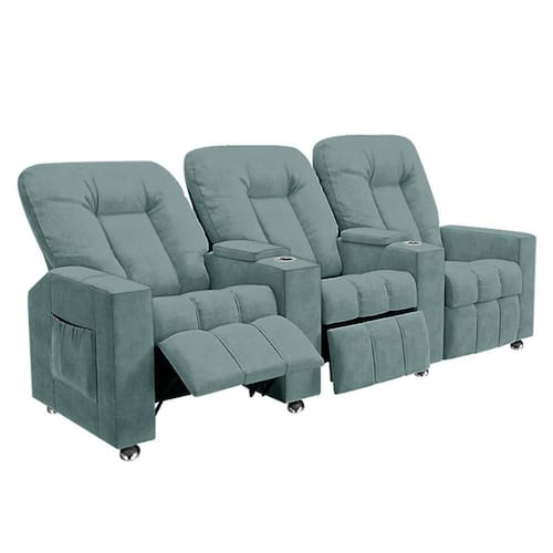 Essa Poltrona Reclinável Para Cinema 3 Lugares Praddo FH9 Veludo Azul Claro, da Mpozenato é a peça projetada para oferecer o máximo conforto e ter seu cinema particular.
