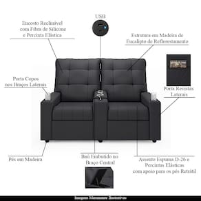 Diferenciais: Apoio de pés retrátil, bolso lateral para revistas e livros, Porta Copos Embutido nos Braços Laterais e Baú porta objetos