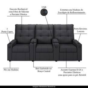 Diferenciais: Apoio de pés retrátil, bolso lateral para revistas e livros, Porta Copos Embutido nos Braços Laterais e Baú porta objetos