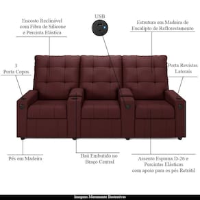 Poltrona Reclinável Para Cinema Parma 3 Lugares Baú Usb Veludo Vinho D'Rossi