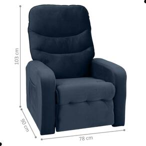 INSTRUÇÕES/CUIDADOS: Limpar com pano macio e seco, não utilizar produtos abrasivos | ALTURA DO PRODUTO (CM): 103 | PESO MÁXIMO SUPORTADO: 110 | DESCRIÇÃO DO TAMANHO: 103x78x90 cm | COMPRIMENTO DO PRODUTO (CM): 90 | COM RODAS: Não | TIPO DE CADEIRA: Poltrona | COMPRIMENTO PRODUTO COM EMBALAGEM (CM): 80 | PESO DO PRODUTO (KG): 37 | CONTEÚDO DA EMBALAGEM: 1 Poltrona | NOME DO PRODUTO NO FORNECEDOR: Poltrona Eletrica | PRODUTO: Poltrona | PESO PRODUTO COM EMBALAGEM (KG): 37 | LARGURA PRODUTO COM EMBALAGEM (CM): 80 | PRODUTO PRECISA DE MONTAGEM?: Sugerimos a contratação de um montador para a montagem do produto. Não nos responsabilizamos por causadas no ato da montagem. | MARCA: CasaH | COM ALTURA AJUSTÁVEL: Sim | ESTADO DE ORIGEM: PR | COR PREDOMINANTE: Azul | LARGURA DO PRODUTO (CM): 78 | COM APOIO DE BRAÇOS: Sim | MATERIAL PRINCIPAL: Veludo | CORES DO PRODUTO (FILTRO DE CORES): Azul | ALTURA DO PRODUTO COM EMBALAGEM (CM): 70 | CÔMODO INDICADO: Sala | É GIRATÓRIA: Não | COM ENCOSTO RECLINÁVEL: Sim | QUANTIDADES DE CAIXAS DE EMBALAGEM: 1 | MATERIAL PARA FILTRO: Veludo