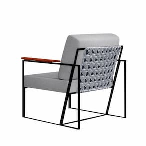 Poltrona Roma Linho Cinza com Rattan e Base em Metal Preto