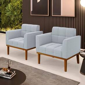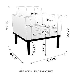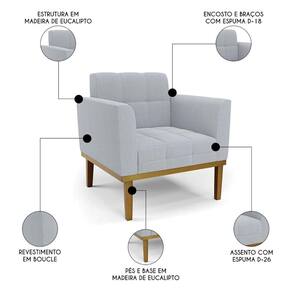 A Poltrona Para Sala é revestida em bouclé, que é confortável, suave ao toque, e ainda valoriza o design da poltrona. Os braços e encosto são confortáveis em espuma D-18, já o assento é com espuma D-26 de alta densidade, que garante um assento firme e aconchegante, ideal para relaxar após um dia cansativo. A base em madeira de eucalipto é um charme à parte, que confere um toque Rústico e sofisticado à peça. São 2 poltronas com estrutura resistente que suporta até 120 kg cada. A montagem é muito simples, pois a poltrona já vem pronta, bastando apenas fixar a base com os parafusos que acompanham o produto. A limpeza também é muito prática, pois basta utilizar um pano limpo e levemente úmido, sem produtos abrasivos, para manter a sua poltrona sempre em bom estado. Sem dúvidas a Poltrona Para Sala vai transformar seu ambiente, deixando mais confortável e estiloso!
