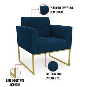 A Poltrona Elisa é uma poltrona que combina elegância, conforto e durabilidade. Ela tem um design retrô e sofisticado, com Base Industrial Dourado e revestimento em tecido Bouclê Azul, que harmonizam com qualquer ambiente. Ela é ideal para sala de estar, recepções, escritórios, cozinhas ou qualquer outro espaço que você queira decorar com estilo e bom gosto. Ela tem uma estrutura em madeira de reflorestamento eucalipto, que garante a resistência e a sustentabilidade do produto. Ela suporta até 120 kg de peso, podendo ser utilizada por pessoas de diferentes biotipos. Ela tem um acabamento reforçado e espuma de qualidade D23, que oferece maciez e aconchego. Ela contém detalhes de costura no encosto e assento, resultando em um acabamento impecável, conferindo muito mais valor e elegância ao produto. A Poltrona Elisa é um móvel de alta qualidade, beleza e funcionalidade. Ela é fácil de transportar, pois tem um peso leve e um tamanho compacto. A Poltrona Elisa é um produto que vai fazer a diferença na sua decoração e no seu bem-estar. Ela vai trazer charme, conforto e durabilidade para o seu ambiente. Aproveite essa oferta e leve para casa uma poltrona de qualidade por um preço incrível. Essa é a sua chance de ter uma poltrona maravilhosa por um preço imperdível. Corra e garanta a sua antes que acabe o estoque!