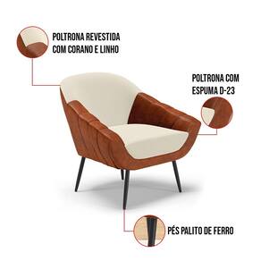 A Poltrona Giovana é uma peça com personalidade marcante que irá atrair todos os olhares! Indispensável para os momentos de leitura e descanso, ela se adapta perfeitamente a diversos ambientes. Pode ser usada para realçar qualquer cantinho da sua sala de estar como complemento decorativo, no quarto como apoio na hora de se vestir, no hall de entrada ganhando destaque principal para receber seus convidados, no escritório como assento extra e vários outros cômodos. Ela possui um peso leve, um tamanho compacto e uma estrutura em madeira de reflorestamento eucalipto, que garante a resistência e a durabilidade do produto. Ela suporta até 120 kg de peso, podendo ser usada por pessoas de diferentes tipos físicos. Ela tem um acabamento reforçado com espuma de qualidade D23, revestida em tecido Corano Nozes com Linho no tom Bege A19 que oferece maciez e aconchego ao sentar-se. Tem pés palito de ferro, que adiciona segurança ao usuário e durabilidade à peça. Nas braças possui frisos tanto na parte interna quanto externa, que além de valorizar ainda mais os detalhes da poltrona proporcionam uma aparência extremamente sofisticada. Que tal adicionar conforto visual ao seu espaço! Invista no bem estar da sua família com o Kit 02 Poltronas.