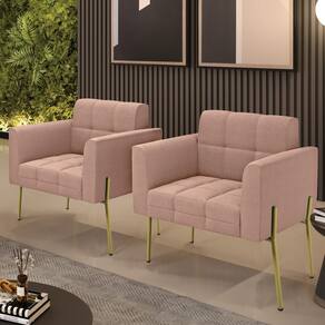 A Poltrona Elisa é uma poltrona que combina elegância, conforto e durabilidade. Ela tem um design retrô e sofisticado, com Pés Laterais de Ferro Dourado e revestimento em tecido Bouclê Rosê, que harmonizam com qualquer ambiente. Ela é ideal para sala de estar, recepções, escritórios, cozinhas ou qualquer outro espaço que você queira decorar com estilo e bom gosto. Ela tem uma estrutura em madeira de reflorestamento eucalipto, que garante a resistência e a sustentabilidade do produto. Ela suporta até 120 kg de peso, podendo ser utilizada por pessoas de diferentes biotipos. Ela tem um acabamento reforçado e espuma de qualidade D23, que oferece maciez e aconchego. Ela contém detalhes de costura no encosto e assento, resultando em um acabamento impecável, conferindo muito mais valor e elegância ao produto. A Poltrona Elisa é um móvel de alta qualidade, beleza e funcionalidade. Ela é fácil de transportar, pois tem um peso leve e um tamanho compacto. A Poltrona Elisa é um produto que vai fazer a diferença na sua decoração e no seu bem-estar. Ela vai trazer charme, conforto e durabilidade para o seu ambiente. Aproveite essa oferta e leve para casa uma poltrona de qualidade por um preço incrível. Essa é a sua chance de ter uma poltrona maravilhosa por um preço imperdível. Corra e garanta seu Kit 2 Poltronas antes que acabe o estoque!