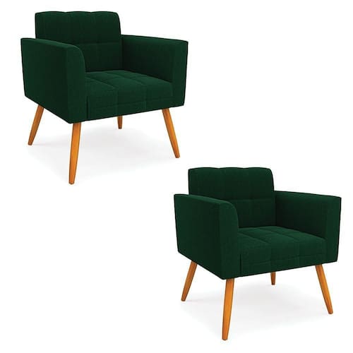 A Poltrona Elisa é uma poltrona que combina elegância, conforto e durabilidade. Ela tem um design retrô e sofisticado, com Pés Palito Castanho e revestimento em tecido Bouclê Verde, que harmonizam com qualquer ambiente. Ela é ideal para sala de estar, recepções, escritórios, cozinhas ou qualquer outro espaço que você queira decorar com estilo e bom gosto. Ela tem uma estrutura em madeira de reflorestamento eucalipto, que garante a resistência e a sustentabilidade do produto. Ela suporta até 120 kg de peso, podendo ser utilizada por pessoas de diferentes biotipos. Ela tem um acabamento reforçado e espuma de qualidade D23, que oferece maciez e aconchego. Ela contém detalhes de costura no encosto e assento, resultando em um acabamento impecável, conferindo muito mais valor e elegância ao produto. A Poltrona Elisa é um móvel de alta qualidade, beleza e funcionalidade. Ela é fácil de transportar, pois tem um peso leve e um tamanho compacto. A Poltrona Elisa é um produto que vai fazer a diferença na sua decoração e no seu bem-estar. Ela vai trazer charme, conforto e durabilidade para o seu ambiente. Aproveite essa oferta e leve para casa uma poltrona de qualidade por um preço incrível. Essa é a sua chance de ter uma poltrona maravilhosa por um preço imperdível. Corra e garanta seu Kit 2 Poltronas antes que acabe o estoque!
