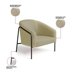 O kit com 2 Poltronas Stella com base industrial alta preta e revestimento em bouclê pistache une conforto e resistência em um único móvel. Seu design moderno apresenta linhas curvas elegantes no encosto e braços integrados, transmitindo aconchego e refinamento. A base metálica alta, feita em tubos arredondados resistentes à oxidação, contorna lateralmente a peça, criando um visual leve e robusto. A estrutura em madeira de eucalipto garante durabilidade, enquanto o estofamento em espuma D-26 de alta densidade proporciona maciez e suporte ergonômico. O aço carbono com pintura eletrostática da base assegura estabilidade e acabamento duradouro. Suportando até 120 kg, a Poltrona Stella é ideal para salas de estar, recepções ou cantos de leitura, agregando bem-estar ao ambiente. Versátil, combina com diferentes estilos, do industrial ao minimalista sofisticado. A Poltrona Stella vem para ser a protagonista da sua decoração, unindo sofisticação e exclusividade. Dimensões do Produto: Altura Total: 80 cm Largura Total: 73 cm Profundidade Total: 67 cm Peso: 21 kg Outras Medidas: Altura do Encosto: 40 cm Largura do Assento: 45 cm Profundidade do Assento: 45 cm Altura do chão ao Assento: 45 cm Espessura do Assento: 15 cm Espessura do Braço: 7 cm Altura do chão ao Braço: 70 cm Altura Interna do Braço: 28 cm Especificações do Produto: Estrutura: Madeira de Eucalipto Material do Estofamento: Espuma D-26 (alta densidade) Revestimento: Bouclê Peso Máximo Suportado: Até 120 Kg Tipo de Pés: Base Industrial Material/Acabamento da Base: Aço Carbono com Pintura eletrostática Inclui Almofada Extra: Não Tipo de Encosto: Fixo Tipo de Assento: Fixo Com Apoio de Pés: Não Com Altura Ajustável: Não É Reclinável: Não É Giratória: Não Diferenciais: Design moderno com linhas curvas; Detalhe lateral em tubo metálico redondo resistente à oxidação. Complexidade da Montagem: Baixa Montagem: O produto vai montado, apenas parafusar a base na poltrona Garantia: 90 dias contra de fabricação Instruções de Limpeza: Utilizar um pano limpo e levemente úmido Quantidade de Volumes: 2 Caixas Medida das Embalagens: Caixa 1: 86 cm x 84 cm x 66 cm; Caixa 2: 86 cm x 84 cm x 66 cm. : É feita somente até o térreo ou portaria. Confira sempre as medidas das embalagens para assegurar que o produto passe por portas e escadas do .