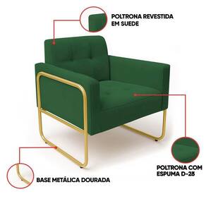 Poltrona Sala Industrial Alta Tubo Dourado Kit 2 Elisa Suede Verde D03 - D'rossi Conheça a combinação perfeita de charme e conforto que o kit 2 Poltronas Elisa proporciona! Com uma estética inspirada no estilo industrial, esta poltrona se destaca pela sua base metálica de design tubular redondo com laterais altas, fabricada em metal de alta qualidade, que confere um toque moderno e sofisticado. A estrutura robusta é construída com madeira de eucalipto reflorestada. O revestimento em tecido Suede Verde, oferece uma textura suave e extremamente agradável ao toque. A costura detalhada no assento e no encosto adiciona à poltrona um toque de requinte. Com capacidade para suportar até 120 kg, esta poltrona é a escolha perfeita para criar um canto de leitura, um espaço de relaxamento ou para complementar a decoração de salas de estar, escritórios, quartos e até mesmo espaços comerciais. Transforme sua casa em um ambiente mais acolhedor e com personalidade. Dimensões do Produto: Altura Total: 81 cm Largura Total: 70 cm Profundidade Total: 64 cm Peso: 16 kg Outras Medidas: Altura do Encosto: 36 cm Largura do Assento: 47 cm Profundidade do Assento: 48 cm Altura do chão ao Assento: 45 cm Espessura do Assento: 20 cm Espessura do Braço: 9 cm Altura interna do Braço: 20 cm Especificações do Produto: Estrutura: Madeira Eucalipto Reflorestada Densidade da Espuma: Espuma D-26 Revestimento: SuedePeso Suportado: Até 120 Kg Tipo de Pés: Base Metálica Laterais Alta Tubular Redonda Acabamento da Base: Pintura eletrostática Material da Base: Metálica em aço carbono Possui Sapatas Niveladora: Sim Com Altura Ajustável: Não Possui Rodízios: Não Com Apoio de Pés: Não Tipo de Encosto: Fixo Tipo de Assento: Fixo Almofada do Assento: Fixa Almofada do Encosto: Fixa Possui Apoio para Braços: Sim Acompanha Almofadas Extras: Não É Retrátil: Não É Reclinável: Não É Extensível: Não É Gamer: Não É Giratória: Não Diferenciais: Design com estilo industrial; Estrutura reforçada ; Costura detalhada no assento e no encosto. Complexidade da Montagem: Baixo Sistema de Montagem: O produto vai montado, apenas parafusar a base Montagem: Recomendamos que seja feita por um Garantia: 90 dias contra de fabricação Instruções de Limpeza: Utilizar um pano limpo e levemente úmido Quantidade de Volumes: 1 Caixa Medida das Embalagens: Caixa 1: 83 x 77 x 72 cm : É feita somente até o térreo ou portaria. Confira sempre as medidas das embalagens para assegurar que o produto passe por portas e escadas do .