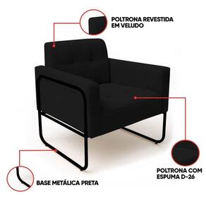 Poltrona Sala Industrial Alta Tubo Preto Elisa Veludo D03 - D'rossi Cor Preto Conheça a combinação perfeita de charme e conforto que a Poltrona Elisa proporciona! Com uma estética inspirada no estilo industrial, esta poltrona se destaca pela sua base metálica preta de design tubular redondo com laterais altas, fabricada em metal de alta qualidade, que confere um toque moderno e sofisticado. A estrutura robusta é construída com madeira de eucalipto reflorestada. O revestimento em tecido Veludo, oferece uma textura suave e extremamente agradável ao toque. A costura detalhada no assento e no encosto adiciona à poltrona um toque de requinte. Com capacidade para suportar até 120 kg, esta poltrona é a escolha perfeita para criar um canto de leitura, um espaço de relaxamento ou para complementar a decoração de salas de estar, escritórios, quartos e até mesmo espaços comerciais. Transforme sua casa em um ambiente mais acolhedor e com personalidade. Dimensões do Produto: Altura Total: 81 cm Largura Total: 70 cm Profundidade Total: 64 cm Peso: 16 kg Outras Medidas: Altura do Encosto: 36 cm Largura do Assento: 47 cm Profundidade do Assento: 48 cm Altura do chão ao Assento: 45 cm Espessura do Assento: 20 cm Espessura do Braço: 9 cm Altura interna do Braço: 20 cm Especificações do Produto: Estrutura: Madeira Eucalipto Reflorestada Densidade da Espuma: Espuma D-26 Revestimento: Veludo Peso Suportado: Até 120 Kg Tipo de Pés: Base Metálica Laterais Alta Tubular Redonda Acabamento da Base: Pintura eletrostática Material da Base: Metálica em aço carbono Possui Sapatas Niveladora: Sim Com Altura Ajustável: Não Possui Rodízios: Não Com Apoio de Pés: Não Tipo de Encosto: Fixo Tipo de Assento: Fixo Almofada do Assento: Fixa Almofada do Encosto: Fixa Possui Apoio para Braços: Sim Acompanha Almofadas Extras: Não É Retrátil: Não É Reclinável: Não É Extensível: Não É Gamer: Não É Giratória: Não Quantidade de Lugares: 1 Lugar Diferenciais: Design com estilo industrial; Estrutura reforçada; Costura detalhada no assento e no encosto. Complexidade da Montagem: Baixo Sistema de Montagem: O produto é enviado montado, sendo necessário somente parafusar a base Montagem: O produto vai montado, apenas parafusar a base Garantia: 90 dias contra de fabricação Instruções de Limpeza: Utilizar um pano limpo e levemente úmido Quantidade de Volumes: 1 Caixa Medida das Embalagens: Caixa 1: 72 x 65 x 57 cm : É feita somente até o térreo ou portaria. Confira sempre as medidas das embalagens para assegurar que o produto passe por portas e escadas do .