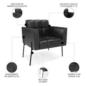 A Poltrona Para Sala é revestida em Sintético PU, que é durável e fácil de limpar, e ainda valoriza o design da poltrona. Os braços e encosto são confortáveis em espuma D-18, já o assento é com espuma D-26 de alta densidade, que garante um assento firme e aconchegante, ideal para relaxar após um dia cansativo. Os Pés de Ferro, não só garantem estabilidade e longevidade, mas também adicionam um toque de luxo ao design geral. São 2 poltronas com estrutura resistente que suporta até 120 kg cada. A montagem é muito simples, pois a poltrona já vem pronta, bastando apenas fixar a base com os parafusos que acompanham o produto. A limpeza também é muito prática, pois basta utilizar um pano limpo e levemente úmido, sem produtos abrasivos, para manter a sua poltrona sempre em bom estado. Sem dúvidas a Poltrona Para Sala vai transformar seu ambiente, deixando mais confortável e estiloso!