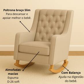 O estofamento em Tecido Saturno proporciona uma suavidade incomparável, enquanto as almofadas com espuma D-26 oferecem um suporte ergonômico que alivia a pressão na coluna. Essa poltrona é ideal para amamentação, com um formato que assegura o bem-estar tanto da mãe quanto do bebê.
