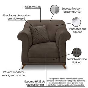 A poltrona Arras tem um toque retro clássico, sua principal característica a versatilidade. Ele se encaixa em qualquer estilo de decoração: na sua casa ou no seu escritório, esse modelo garante beleza e conforto. Feito em madeira de reflorestamento e com suas espumas de alta resiliência tem como principal característica, o alto poder de retorno ao seu estado inicial, o que garante mais conforto e maior durabilidade nos produtos Acompanha Almofadas extras: 01 Acompanha Puff: Não Almofada do assento: Fixa Almofada do encosto: Fixa Altura do assento até o chão: 45 Altura do Encosto: 45 Altura dos Pés: 12 Ambiente Principal: Sala de Estar Complexidade da Montagem: Baixa: pode ser montado por uma pessoa sozinha Cor: Marrom Cor do Produto: Marrom Design Assinado: Não Enchimento do Assento: Espuma D-28 Enchimento do Braço: Espuma D-26 Enchimento do Encosto: Espuma D-26 Encosto para a Cabeça: Não Estampado: Não Extensível: Não Firmeza do Assento: Macio Informações Complementares: A poltrona Arras tem um toque retro clássico, sua principal característica a versatilidade. Ele se encaixa em qualquer estilo de decoração: na sua casa ou no seu escritório, esse modelo garante beleza e conforto. Feito em madeira de reflorestamento e com Itens Inclusos: 1 Poltrona Linha ou Coleção: Arras Manual de Montagem e Instalação: https://cdn2.madeiramadeira.com.br/atributo/spezzia-decor/1254110-manual-arras-pdf.pdf Material do Braço: estofado Material dos Pés: Madeira Maciça Modelo de Poltrona: Fixo Necessita Montagem: Sim Origem do Produto: Nacional Peso: 27.5 Possui Percintas Elásticas: Sim Possui Pés: 04 Possui Rodízio: Não Recomendações de Uso, Manutenção e Limpeza: Limpeza: Utilize pano levemente úmido Sistema de Montagem: É necessário apenas fixar os pés. Suporta Até (kg): 150 Tecido Predominante: Veludo Tipo de Assento: Fixo Tipo de Encosto: Fixo Tipo de Espuma do Assento: Espuma HR Tipo de Poltrona: Decorativa
