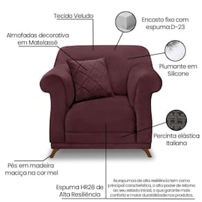 A poltrona Arras tem um toque retro clássico, sua principal característica a versatilidade. Ele se encaixa em qualquer estilo de decoração: na sua casa ou no seu escritório, esse modelo garante beleza e conforto. Feito em madeira de reflorestamento e com suas espumas de alta resiliência tem como principal característica, o alto poder de retorno ao seu estado inicial, o que garante mais conforto e maior durabilidade nos produtos Acompanha Almofadas extras: 01 Acompanha Puff: Não Almofada do assento: Fixa Almofada do encosto: Fixa Altura do assento até o chão: 45 Altura do Encosto: 45 Altura dos Pés: 12 Ambiente Principal: Sala de Estar Complexidade da Montagem: Baixa: pode ser montado por uma pessoa sozinha Cor: Vinho Cor do Produto: Vinho Design Assinado: Não Enchimento do Assento: Espuma D-28 Enchimento do Braço: Espuma D-26 Enchimento do Encosto: Espuma D-26 Encosto para a Cabeça: Não Estampado: Não Extensível: Não Firmeza do Assento: Macio Informações Complementares: A poltrona Arras tem um toque retro clássico, sua principal característica a versatilidade. Ele se encaixa em qualquer estilo de decoração: na sua casa ou no seu escritório, esse modelo garante beleza e conforto. Feito em madeira de reflorestamento e com Itens Inclusos: 1 Poltrona Linha ou Coleção: Arras Manual de Montagem e Instalação: https://cdn2.madeiramadeira.com.br/atributo/spezzia-decor/1254116-manual-arras-pdf.pdf Material do Braço: estofado Material dos Pés: Madeira Maciça Modelo de Poltrona: Fixo Necessita Montagem: Sim Origem do Produto: Nacional Peso: 27.5 Possui Percintas Elásticas: Sim Possui Pés: 04 Possui Rodízio: Não Recomendações de Uso, Manutenção e Limpeza: Limpeza: Utilize pano levemente úmido Sistema de Montagem: É necessário apenas fixar os pés. Suporta Até (kg): 150 Tecido Predominante: Veludo Tipo de Assento: Fixo Tipo de Encosto: Fixo Tipo de Espuma do Assento: Espuma HR Tipo de Poltrona: Decorativa