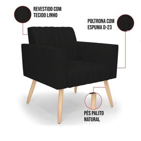 Quer uma decoração única e sofisticada? A Poltrona Viena é ideal para quem está em busca de um móvel versátil e diferenciado. Esse tipo de peça é ideal para ambientes modernos e descontraídos. Vem com uma ideia totalmente diferente, devido sua curva e forma suave, os detalhes gomados do tecido são tendências de decoração atuais. O tom Preto vem ganhando cada vez mais espaço no mercado, uma cor que traz elegância e combina com vários tipos de decoração. Uma dica legal de complemento é escolher almofadas que combinem com a poltrona. Sua estrutura é confeccionada em madeira de eucalipto proveniente de reflorestamento, o estofamento do assento é composto de espuma prorelax D-28 no encosto, e é revestido em Linho um tecido aconchegante, resistente e extremamente luxuoso. Sua sustentação é dada pelos tradicionais pés palito natural, suportando em média até 115 Kg. Crie um lindo efeito visual, em qualquer lugar da sua casa ou escritório! Garanta já sua Poltrona Viena.