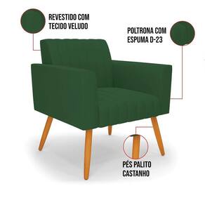 Quer uma decoração única e sofisticada? A Poltrona Viena é ideal para quem está em busca de um móvel versátil e diferenciado. Esse tipo de peça é ideal para ambientes modernos e descontraídos. Vem com uma ideia totalmente diferente, devido sua curva e forma suave, os detalhes gomados do tecido são tendências de decoração atuais. O tom Verde vem ganhando cada vez mais espaço no mercado, uma cor que traz elegância e combina com vários tipos de decoração. Uma dica legal de complemento é escolher almofadas que combinem com a poltrona. Sua estrutura é confeccionada em madeira de eucalipto proveniente de reflorestamento, o estofamento do assento é composto de espuma prorelax D-28 no encosto, e é revestido em Veludo um tecido aconchegante, resistente e extremamente luxuoso. Sua sustentação é dada pelos tradicionais Pés Palito Castanho, suportando em média até 115 Kg. Crie um lindo efeito visual, em qualquer lugar da sua casa ou escritório! Garanta já sua Poltrona Viena.