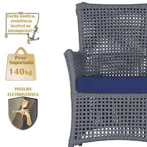 A corda nautica adiciona um toque de rusticidade moderna, enquanto o estofado impermeavel garante que sua poltrona esteja sempre impecavel, mesmo apos uma chuva inesperada ou um acidente com liquidos.