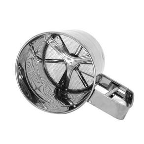 Polvilhador Inox Luxo Peneirar Caneca Farinha Com Gatilho Polvilhador / Peneirador de Farinha Excelente durabilidade é um ótimo auxílio para sua confeitaria. Esta Caneca Polvilhadora é um utensílio prático para peneirar farinha, açúcar ou outros ingredientes secos. A tela em inox com 1 mm de medida peneira extremamente bem. Possui um mexedor para facilitar o seu trabalho. Apertando o gatilho na alça irá movimentar e peneirar o ingrediente.