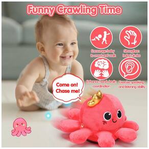 O Baby Toys Musical Crawling & Walking Octopus T899 é um brinquedo educativo em forma de polvo de pelúcia com luzes, música e movimento, criado para estimular bebês a engatinhar e dar os primeiros passos. O brinquedo gira, anda acompanhado de músicas, acende luzes e grava e repete frases com pronúncia clara, atraindo a atenção do bebê e incentivando a interação. O conjunto inclui 1 polvo interativo, 1 chave de fenda e 1 guia de uso para facilitar a instalação das pilhas e o acionamento das funções.