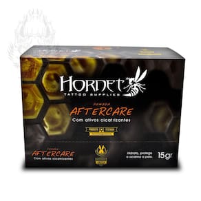 Após a lavagem da área tatuada com água e sabonete neutro, secar bem e aplicar a Pomada Aftercare Hornet conforme orientação do tatuador.