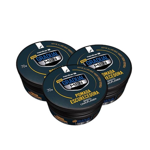 Pomada escurecedora de cabelo e barba 3x menfirst Descrição do produto A pomada escurecedora gradual men, de tonalidade preta, auxilia na neutralização dos fios brancos além de definir e controlar os cabelos rebeldes e com frizz, proporciona fixação com definição de penteados para a criação dos mais diferentes estilos.