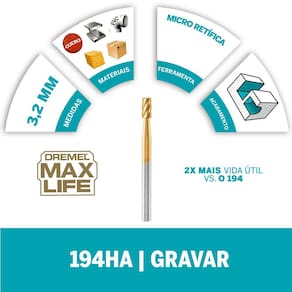 - A linha de acessórios Dremel® MaxLife – projetada por nossos engenheiros – oferece máxima durabilidade e desempenho a longo prazo. A ponta de gravar Dremel MaxLife 194HP para trabalhos exigentes é revestida com nitreto de titânio, por isso dura o dobro do tempo do acessório padrão não revestido.