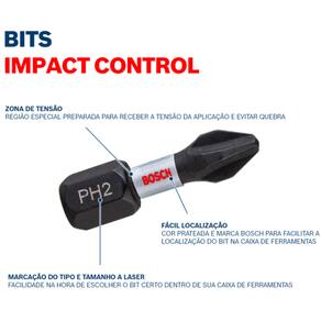 As Pontas Bosch Impact Control são extremamente robustas e executam parafusamentos em alta performance. As Pontas possuem a zona de torção alongada o que traz resistência para trabalhos de longa duração, além disso o aço modificado S2 juntamente com um tratamento térmico otimizado trazem robustez e alto desempenho, suportando a elevada potência das chaves de impacto o que proporciona alto torque nas aplicações. Dessa forma as Pontas Impact Control são ideais para aplicações intensas como trabalhos industriais pesados e instalações de fábricas. O portfólio Bosch Impact Control é completo e possui Pontas Philips (PH), Pozidriv (PZ) e Torx (T) com encaixe hexagonal 1/4" disponíveis em diferentes tamanhos e embalagens.