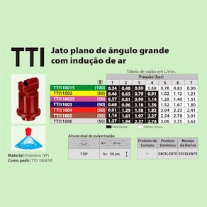 Além disso, a facilidade de alinhamento é assegurada quando utilizada em conjunto com a capa e o anel de vedação Quick TeeJet. Seja para agricultura, horticultura ou outras aplicações agrícolas, a Ponta de Pulverização Teejet TTI11002-VP Amarelo oferece desempenho excepcional e precisão na distribuição de produtos químicos, tornando-se uma escolha confiável para profissionais do setor.