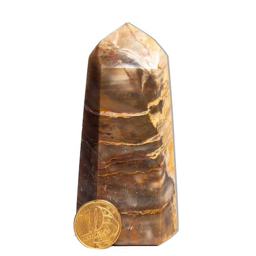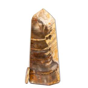 Esta peça única de Jaspe Monet é uma pedra natural mineral lapidada manualmente em formato de gerador sextavado com 6 faces e pico. Com cores vibrantes de marrom, rajas bege, cinza e toques de branco, ela é perfeita para colecionadores, práticas esotéricas ou para decorar ambientes, trazendo energia e sofisticação.
