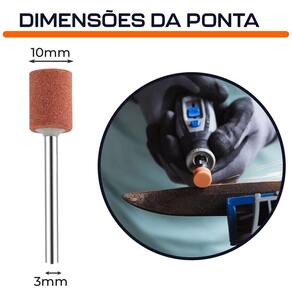 Ponta Montada 10mm Cilíndrica Rebolo Abrasivo Haste 3mm Óxido de Alumínio para Micro Retíficas Dremax - Marca: Dremax - Referência: PM091 - Diâmetro da Haste: 3mm - Diâmetro da ponta: 10mm - Formato: Cilíndrica - Material: Óxido de Alumínio - Ponte de alta qualidade, indicada para afiar, eliminar rebarbas e efetuar trabalhos gerais de esmerilhamento na maioria dos materiais, incluindo aço inoxidável - Várias aplicações como afiar lâminas de cortadores de grama, pontas de chave de parafusos, facas, tesouras, cinzéis e outras ferramentas de corte - Utilize para remover arestas de peças fundidas de metal, eliminar rebarbas de qualquer metal após o corte, alisar uniões soldadas, esmerilhar rebites e remover ferrugem - Indicada para limpeza, desbaste e acabamentos em superfícies - Uso em micro retíficas de qualquer marca com mandril de 3mm - Indicada para afiação, esmerilhamento e desbaste em metais, joias, pedras preciosas, vidro, entre outros materiais - Seu formato facilita o trabalho em locais de difícil acesso - : 90 dias contra defeitos de fabricação A DREMAX é a primeira e única marca brasileira dedicada exclusivamente às micro retíficas, acessórios e acoplamentos para esta indispensável ferramenta. Seja para trabalhos de precisão, artesanato, modelagem ou reparos, a DREMAX tem o produto certo para você Marca: Não Informado