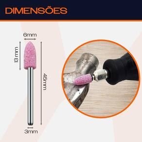 - Marca: Dremax - Referência: PM027 - Diâmetro da ponta: 6mm - Altura da ponta: 13mm - Comprimento total: 45mm - Diâmetro da haste: 3mm - Gramatura: Grão 120 - Formato: Cônica Ponta de Bala - Material da ponta: Óxido de alumínio Rosa Corundum - Indicada para limpezas e acabamentos em superfícies - As pontas montadas rosa são indicadas para uso geral - Uso em micro retíficas de qualquer marca com mandril de 3mm - Indicada para afiação, esmerilhamento e desbaste em metais, joias, pedras preciosas, vidro, entre outros materiais - Seu formato facilita o trabalho em locais de difícil acesso - Garantia: 90 dias contra defeitos de fabricação