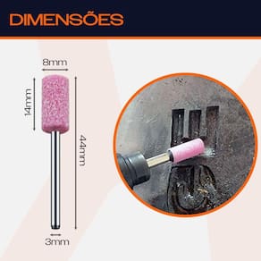 - Marca: Dremax - Referência: PM023 - Diâmetro da ponta: 8mm - Altura da ponta: 14mm - Comprimento total: 44mm - Diâmetro da haste: 3mm - Formato: Cilíndrica - Gramatura: Grão 120 - Material da ponta: Óxido de alumínio Rosa Corundum - Indicada para limpezas e acabamentos em superfícies - As pontas montadas rosa são indicadas para uso geral - Uso em micro retíficas de qualquer marca com mandril de 3mm - Indicada para afiação, esmerilhamento e desbaste em metais, joias, pedras preciosas, vidro, entre outros materiais - Seu formato facilita o trabalho em locais de difícil acesso - Garantia: 90 dias contra defeitos de fabricação