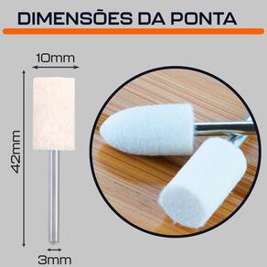 Ponta Montada de Feltro 10mm Cilíndrica Haste 3mm para Polimento com Micro Retíficas Dremax - Marca: Dremax - Referência: PM075 - Diâmetro da Ponta: 10mm - Comprimento: 42mm - Diâmetro da haste das pontas: 3mm - Indicado para polimentos - Formato: Cilíndrica - Uso em micro retíficas de qualquer marca que suporte prender hastes de 3mm - Para polir metais e plásticos em superfícies planas ou orifícios - Indicada para polimento de metais ferrosos ou não ferrosos, aço, aço inoxidável, alumínio, bronze, cobre, latão e plástico em geral - : 90 dias contra defeitos de fabricação A DREMAX é a primeira e única marca brasileira dedicada exclusivamente às micro retíficas, acessórios e acoplamentos para esta indispensável ferramenta. Seja para trabalhos de precisão, artesanato, modelagem ou reparos, a DREMAX tem o produto certo para você. Marca: Não Informado