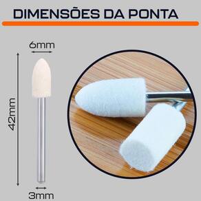 Ponta Montada de Feltro 6mm Cônica com Haste 3mm para Polimento com Micro Retíficas Dremax - Marca: Dremax - Referência: PM078 - Diâmetro da Ponta: 6mm - Comprimento: 42mm - Diâmetro da haste das pontas: 3mm - Indicado para polimentos - Formato: Cônica tipo bala - Uso em micro retíficas de qualquer marca que suporte prender hastes de 3mm - Para polir metais e plásticos em superfícies planas ou orifícios - Indicada para polimento de metais ferrosos ou não ferrosos, aço, aço inoxidável, alumínio, bronze, cobre, latão e plástico em geral - Garantia: 90 dias contra defeitos de fabricação A DREMAX é a primeira e única marca brasileira dedicada exclusivamente às micro retíficas, acessórios e acoplamentos para esta indispensável ferramenta. Seja para trabalhos de precisão, artesanato, modelagem ou reparos, a DREMAX tem o produto certo para você. Marca: Dremax Ean: 7734625985420