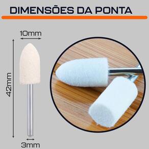 Ponta Montada de Feltro 10mm Cônica com Haste 3mm para Polimento com Micro Retíficas Dremax - Marca: Dremax - Referência: PM080 - Diâmetro da Ponta: 10mm - Comprimento: 42mm - Diâmetro da haste das pontas: 3mm - Indicado para polimentos - Formato: Cônica tipo bala - Uso em micro retíficas de qualquer marca que suporte prender hastes de 3mm - Para polir metais e plásticos em superfícies planas ou orifícios - Indicada para polimento de metais ferrosos ou não ferrosos, aço, aço inoxidável, alumínio, bronze, cobre, latão e plástico em geral - Garantia: 90 dias contra defeitos de fabricação A DREMAX é a primeira e única marca brasileira dedicada exclusivamente às micro retíficas, acessórios e acoplamentos para esta indispensável ferramenta. Seja para trabalhos de precisão, artesanato, modelagem ou reparos, a DREMAX tem o produto certo para você. Marca: Dremax