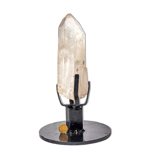Adquira esta formação de ponta de quartzo cristal, um cristal natural impressionante, ideal para quem busca um item único e poderoso para energizar e embelezar seu ambiente. Esta peça fascinante vem com base serrada e é apoiada sobre uma fatia de geodo cristalizado polido manualmente, conferindo sofisticação e beleza. Ideal para:\nMesa de escritório Peso de papel Colecionadores de cristais Uso esotérico e energização de ambientes Presentes especiais e decoração\nDetalhes da Peça:\nNome da Pedra: Quartzo Cristal Cor da Pedra: Incolor, transparente Corte da Pedra: Ponta de quartzo bruta, com base para destacar a pedra Claridade da Pedra: Transparente, com excelente claridade Medidas Aproximadas: 27 cm com base e 20 x 6,5 cm sem base Peso Aproximado: 956g sem base. 2.100g com base Origem: Rio Grande do Sul, Brasil e Uruguai\nO Quartzo Cristal é amplamente conhecido por suas poderosas propriedades de purificação, amplificação de energias e clareza mental. Este cristal é perfeito para quem busca revitalizar a energia de seu ambiente e atrair boas vibrações. Cada peça é única, que potencializam a conexão energética, tornando-a uma adição rara e valiosa para sua coleção. Por que escolher a Ponta de Quartzo Cristal? Além de ser uma excelente adição à sua coleção, este cristal tem a capacidade de transformar a energia de seu espaço. A presença do quartzo cristal não só embeleza seu ambiente, mas também cria uma atmosfera de purificação, equilíbrio e harmonia. Perfeita para quem busca um toque esotérico e sofisticado, a ponta de quartzo cristal é ideal para o seu escritório, altar espiritual ou como um presente energético e elegante. Adquira agora a sua Ponta de Quartzo Cristal e transforme seu ambiente com a energia purificadora e revigorante desta pedra única! Marca: CristaisdeCurvelo