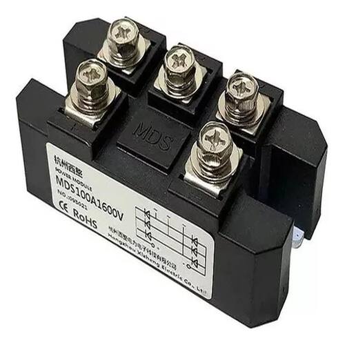Modelo: mds100a Corrente de saída dc : 100a Tensão reversa de pico repetitiva ac : 1600v Fase: trifásica Número de terminais: 5 Diâmetro dos furos de fixação: 6mm Dimensões: 80,5 x 39,7 x 32mm Peso: 121g Marca: Não Informado