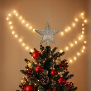 Seu formato simétrico de estrela com 15cm de altura confere destaque e brilho ao pinheiro, sendo ideal para árvores de diversos tamanhos. O modelo luxo une beleza, leveza e praticidade, com encaixe fácil e seguro na ponta do pinheiro.