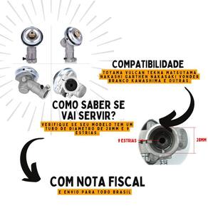 leia atentamente a descrição antes de comprar o produto - produto de alta qualidade e durabilidade. - produto da loja compativel com modelos citados. - aconselha-se um para manutenção do seu equipamento. - imagens meramente ilustrativas. ========================== Item:ponteira completa de transmissão para roçadeira Compatibilidade de modelos: 40 à 55 cilindradas Diametro do tubo: 28mm Estrias: 9 Compatibilidade de marcas: vulcan, toyama, branco garthen, nakashi, trapp shindaiwa, kawashima, yamasaki e outras marcas. + importante Verifique antes da compra se sua ponteira a ser substituida também é 28mm de tubo e 9 estrias. ========================== A os produtos são novos R: todos os produtos da são novos com do seu fabricante. D como são realizadas as entregas R: todas as entregas utilizamos o martket place, sistema de logística do próprio market place, envio mais rápido e seguro do brasil. Entregas em área rural sítios , fazendas , chácaras , estâncias , quinta , granjas e outras exceto as que tenham cep próprios , logradouros de difícil acesso ou em áreas de risco . Podem não serem realizadas ou chegar depois do prazo previsto. Nesses casos é recomendável ter um outro endereço de entrega no centro da cidade do cep informado. R: sim, desde que more perto de nossa loja física, localizada em capital. F os produtos possuem R: todos produtos possuem direto com o seu fabricante de no mínimo 3 meses de acordo com a lei. Esse prazo estará no anúncio. G qual a marca desse produto R:este produto é de uma peça vendida com a marca buybuy. A mesma não se enquadra e se configura a um produto de outra marca ou fabricante que não seja a buybuy H -aceitamos troca de dados de faturamento após compra R: confira o seu endereço de entrega cadastrado, pois não aceitamos alterações do mesmo após a compra. Marca: Não Informado