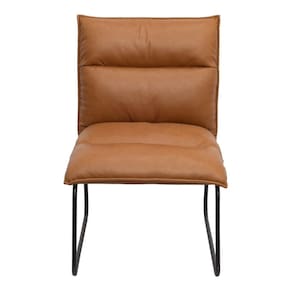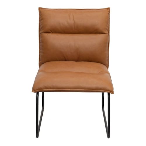 Poltrona com assento em espuma de alta densidade, revestido em PU na cor caramelo, proporcionando conforto e sofisticação. Base em aço com pintura eletrostática preta, garantindo resistência e um design contemporâneo.