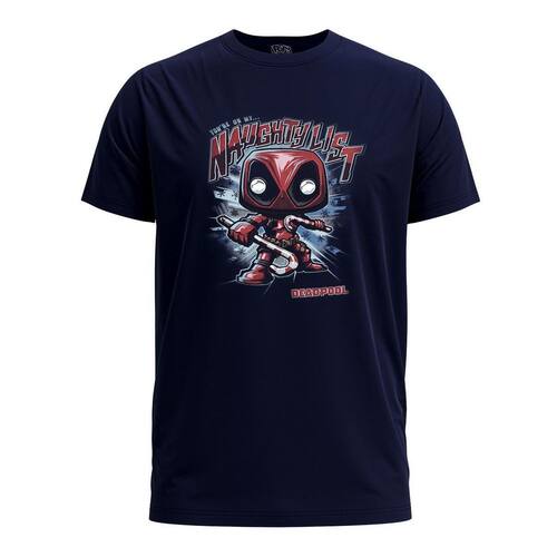 Essa camiseta é estampada com o personagem deadpool pronto para atacar enquanto segura um conjunto de bastões de doces festivos. Com a frase youre on my naughty list você está na minha lista impertinente aparecendo acima dele