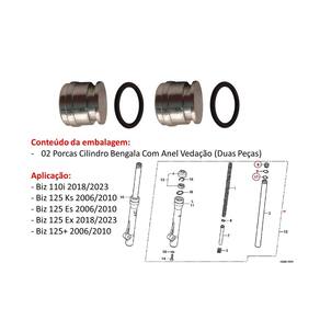 Porca Cilindro Bengala + Anel Vedação Biz 110i Biz 125 Par Aplicação: - Biz 110i 2018/2023 - Biz 125 Ks 2006/2010 - Biz 125 Es 2006/2010 - Biz 125 Ex 2018/2023 - Biz 125+ 2006/2010 Conteúdo da embalagem: - 02 Porca Cilindro Bengala Com Anel Vedação Duas Peças Marca: Não Informado