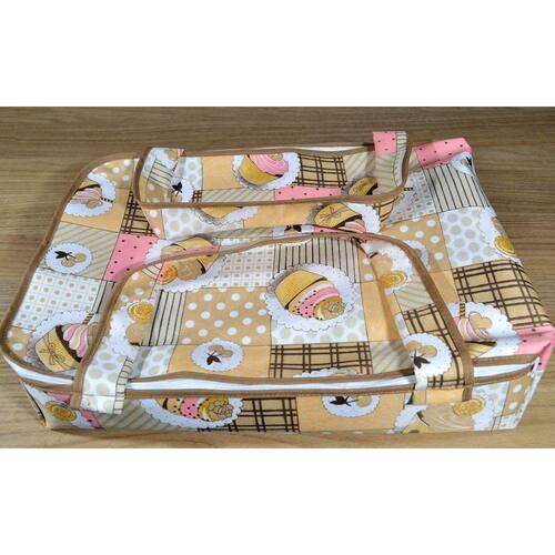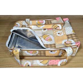 Porta assadeira em tecido oxford com estampa de vários cup cakes coloridos, nas cores palha, marrom, salmão e branco e detalhes quadriculados, bolinhas e listrinhas, revestimento interno com manta térmica, ziper em três laterais na cor branco e acabamento em viés na cor bege.