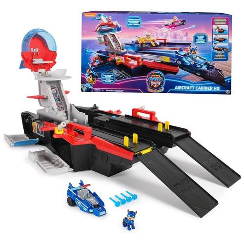 O QG do porta aviões PAW Patrol é um brinquedo transformador que proporciona emocionantes missões de resgate em mares falsos. Ele vem com uma figura de ação genuína da Patrulha Canina The Mighty Movie Chase e um autêntico veículo de resgate de carro de polícia do Chases O QG do porta aviões se transforma de 66 cm de comprimento e 35 cm de largura, até 93 cm de comprimento e 43 cm de largura quando entra no modo de resgate.