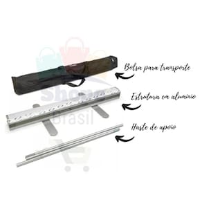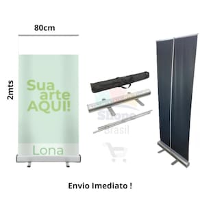Porta banner roll-up 80x200cm com bolsa para transporte Porta banner roll-up - modelo 80x200 O porta banner roll-up é prático e fácil de montar. Não requer ferramenta. Perfil de alumínio superior com trava. O banner pode ser substituído pelo próprio usuário.O seu sistema permite a proteção do banner dentro da estrutura, garantindo maior durabilidade.O suporte roll-up é em alumínio com acabamento fosco o que proporciona um design elegante, valorizando ainda mais o seu evento.O banner pode ser impresso em lona fosca, pet ou tecido.CaracterísticasFácil de montar;Design elegante e sofisticado;Base e haste em alumínio foscoPara banner em lona fosca, pet ou tecidoBolsa de nylon incluso.EspecificaçõesModelo - porta banner roll up 80x200Medidas para transporte - 15 x 15 x 80 cm Peso - 1,700kg Marca: Porta Banner