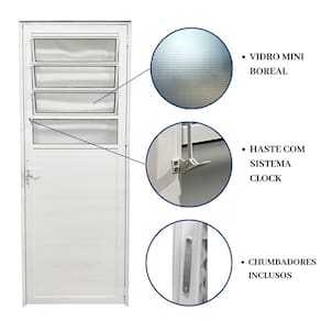 NÃO recomendamos o uso de espuma expansiva na instalação, pois pode danificar o produto. Deve estar em nível e prumo e é imprescindível estar em esquadro para que a funcionalidade e qualidade sejam de 100%. Abertura para Ventilação: Sim Acompanha Batedor: Não Acompanha Batente: Sim Acompanha Dobradiça: 03 Acompanha Fechadura: Sim Acompanha Ficha Técnica: Sim Acompanha Grade: Não Acompanha Guarnição: Não Acompanha Manual de Instalação: Sim Acompanha Puxador: Não Acompanha Trinco: Não Altura: 210 cm Ambiente Principal: Sala de Estar Complexidade da instalação: Alta: deve ser montado por um montador especializado Cor: Branco Cor do Batente: Branco Cor do Produto: Branco Cor do Vidro: Incolor Cor Predominante: Branco Elétrica: Não Escala de Brilho: Semi-Brilho Espessura: 4,5 cm Espessura do Vidro: 3 mm Imune à corrosão: Sim Imune a cupim: Sim Indicações de Uso: Externa e interna Isolamento Acústico: Não Itens Inclusos: 1 Porta Lado de abertura: Direita Largura: 80 cm Largura do Batente: 4,5 cm Linha ou Coleção: Linha Veneza Manual de Montagem e Instalação: https://product-hub-prd.madeiramadeira.com.br/874370/documents/cf99080e-261b-403e-bd5a-28621a8317adOesdeinstalaCAoportadegiro.pdf Material da Dobradiça: Alumínio Material do Batente: Alumínio Material Principal: Alumínio Necessita Instalação: Sim Origem do Produto: Nacional Peso: 12 kg Possui friso: Não Possui Grade: Não Possui Vidro: Sim Preenchimento da Porta: Sólida Quantidade de Folhas: 01 Recomendações de Uso, Manutenção e Limpeza: Massa de polir, pano perflex Resistência à Água: Sim Resistência à Maresia: Sim Resistência a umidade: Sim Textura da Porta: Com detalhe vidro Tipo de Batente: Fixo Tipo de Dobradiça: Simples Tipo de Fechadura: Comum Tipo de Porta: Abrir Tipo de Vidro: Mini Boreal Vidro incluso: Sim Marca: Esquadrias Bergamo