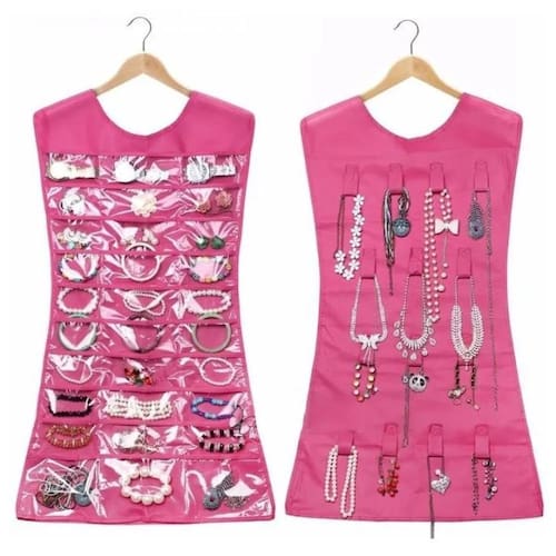 Porta Bijuterias Organizador de Jóias Cabide não acompanha o cabide . Ideal para organizar suas bijuterias dentro do armário, pendurando o organizador em um cabide. Possui 30 bolsos individuais de vinil transparente para guardar brincos, anéis, relógios e pulseiras...A parte traseira possui 14 ganchos para pendurar colares. Ideal para quem gosta de organização, um ótimo presente.